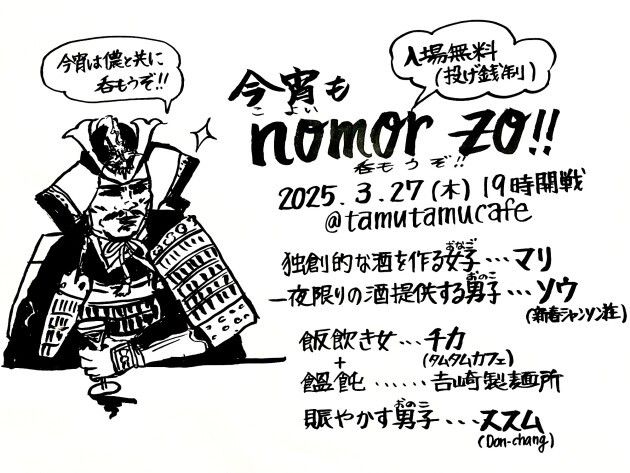 ひょうきんが服を着て歩く姉さんこと流離のバーテンダーまりちゃんと、年末に惜しまれつつ閉店した味園ビル2Fの癒しの酒場新春シャンソン荘の主そうくんをタムタムカフェに召喚!バーカンにはそうくんが…オリジナルカクテルはまりちゃんが…BGMにはみんなのどんちゃん!フードは岡山のそうくんの実家である吉崎製麺所のうどんをスタンバイ!それだけでもう呑める、いや呑もうぞ!今宵もnomor zo!!