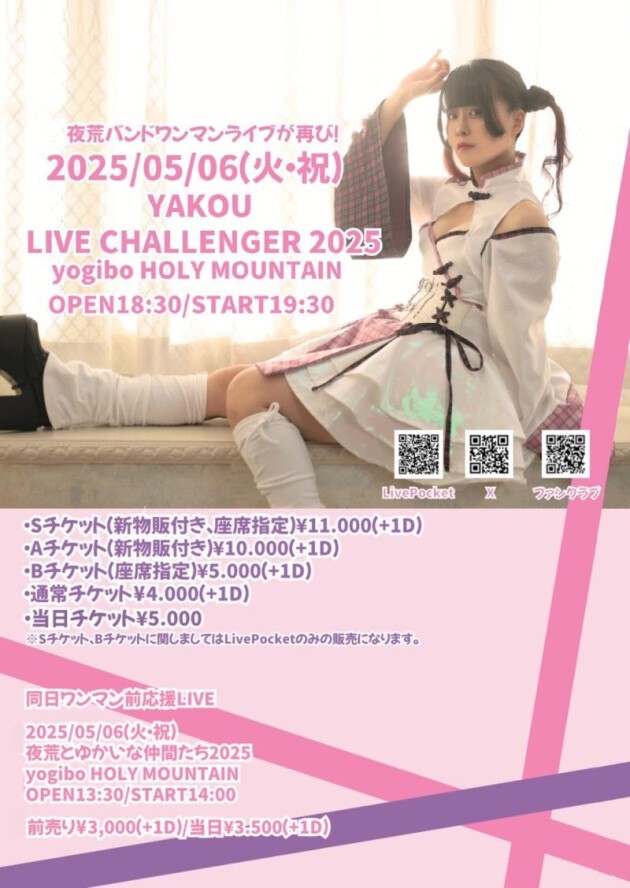 <ACT> YAKOU <TICKET> ・Sチケット(新物販付き、座席指定)¥11.000 (+1D) ・Aチケット(新物販付き)¥10.000 (+1D) ・Bチケット(座席指定)¥5.000 (+1D) ・通常チケット¥4.000 (+1D) ※Sチケット、Bチケットに関しましてはLIVEPocketのみの販売になります。 https://t.livepocket.jp/e/yakoulive2025