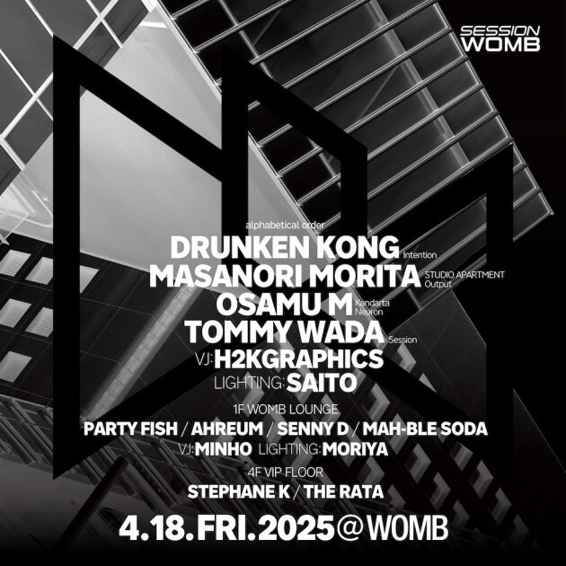 WOMB のレジデントパーティ SESSION (セッション)。2001年にスタートして以来、トライバルハウス、テクノ、ハウスと時代の進化に沿ったメインストリームの4つ打ちを中心に、これまでに国内外のDJたちが出演してきた。
