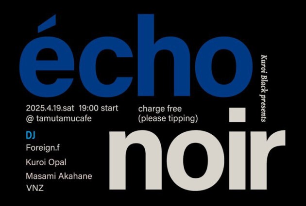 Kuroi Opal主催のParty『Kuroi Black presents écho noir』 @tamutamucafe 待望の開催!『noir』のミニVer.として、テクノ、ハウス、エレクトロなどを中心の内容になります。入場無料の投げ銭Partyですのでお気軽にどうぞ!