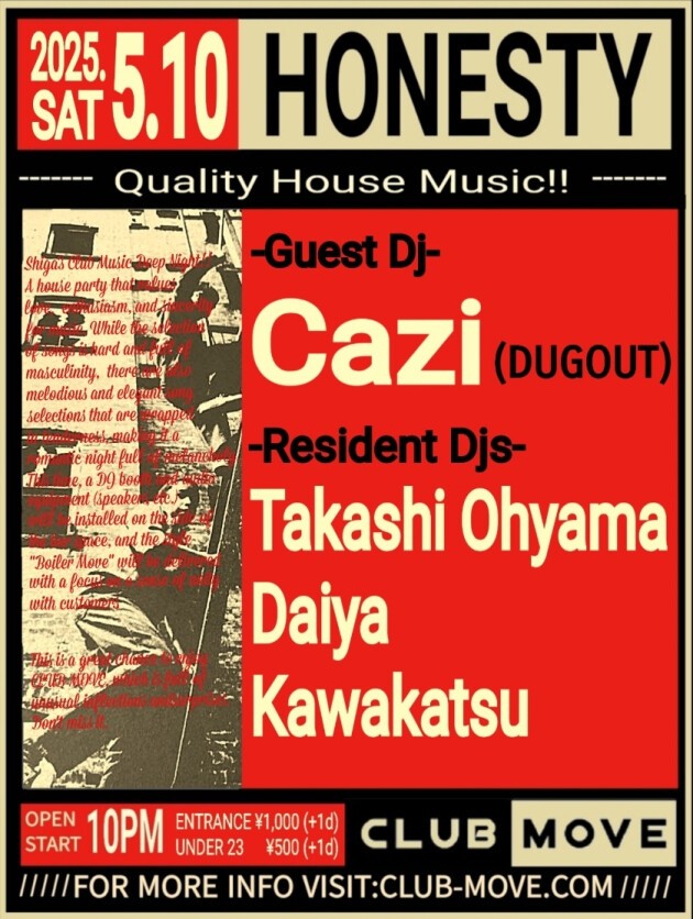 今回は大阪のDUGOUTよりCazi氏がGuestで登場!クラブカルチャーを知り尽くされたナイスな選曲から繰り広げられる心地良いサウンドに身を委ね、増幅する気持ちが開放された時、フロアは多幸感溢れる景色へと変わる事でしょう…