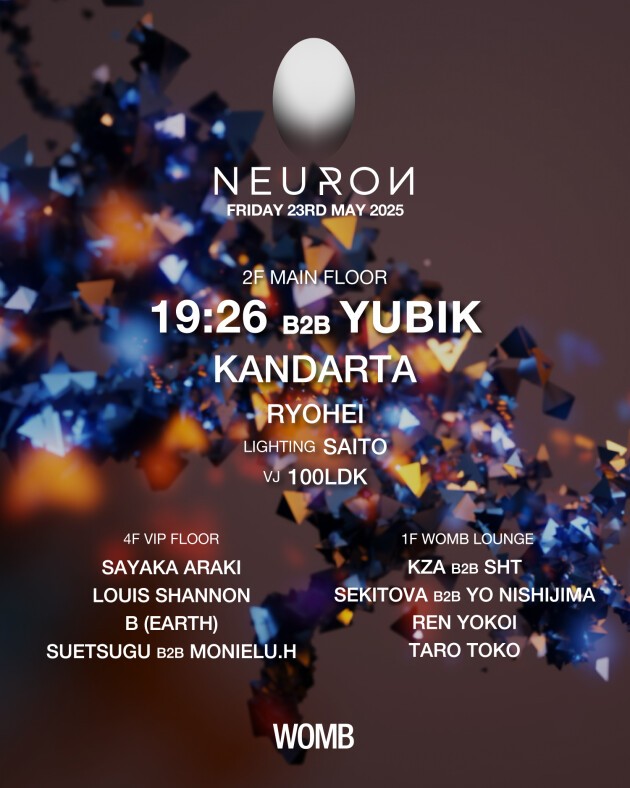 今月、STEPHAN BODZIN をゲストに迎え開催された ZERO-SITE でのイベントが記憶に新しい NEURON が、5/23(金)にホーム WOMB で約1年ぶりに開催する。そのゲストには AFTERLIFE でアップカミング・アーティストとして今最も注目される 19:26 が初来日。しかも今回、NEURON からの熱烈オファーにより息の合った YUBIK との B2B が実現する。