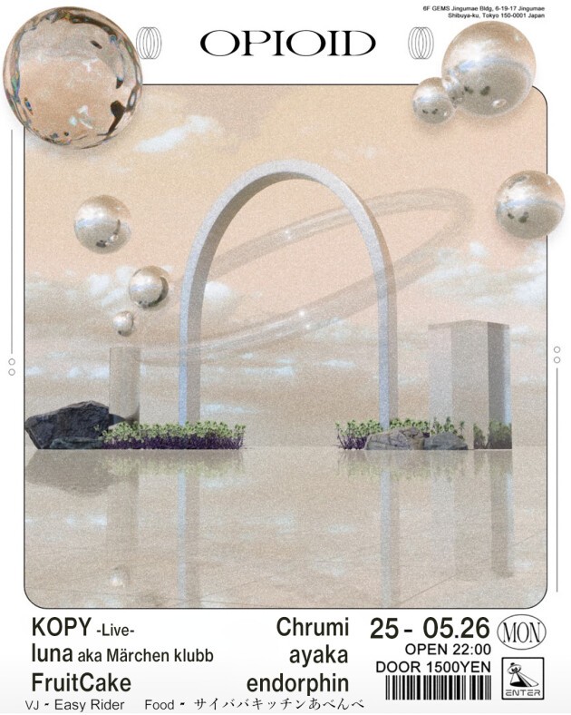 近年、気鋭のフィメールDJとして頭角を表すendorphinが主宰するニューパーティ。 パーティ名が示すオピオイド(OPIOID)とは植物由来、化合物由来、内因性由来の3つの由来に分類される。ここでは植物由来を(音)、化合物由来を(空間)、そして内因性由来を(エンドルフィン本人)と新たに定義し、その3つの由来である、それぞれのオピオイドがもたらす鎮痛、陶酔、多幸感をそこに集う全ての人々とシェアし合う事を目的にスタートする。vol,2のヘッドライナーにはライヴセットに定評のあるKopy氏を迎え、心から音楽に陶酔する一夜を提案する。