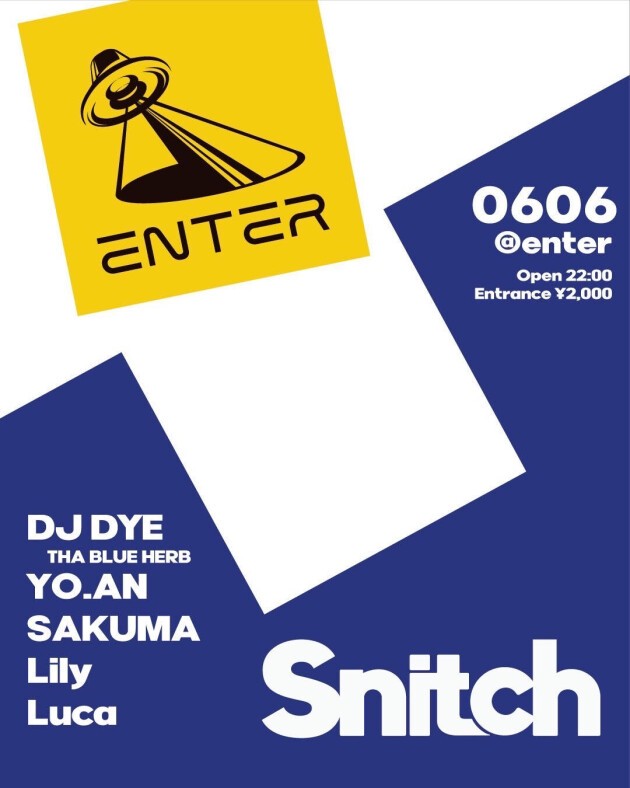 青山の老舗クラブRED BARで開催されていたKenny主催のSnitchをENTERで初開催。キャパシティが増えた今回、言わずと知れた北海道を代表するヒップホップグループTHA BLUE HERBの神経といっても過言ではないDJ DYEを筆頭に、熟練者が一夜を共にする。