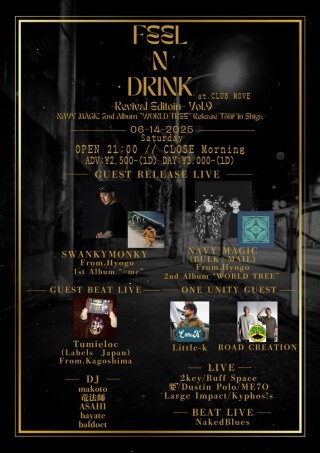 Hailing from Kagoshima Prefecture and residing in Shiga Prefecture, beatmaker NakedBlues has been hosting "FEEL N DRINK" at K.S BAR irregularly since 2020. The event has now moved to CLUB MOVE and is making a comeback after about a year and a half. As release guests, SWANKYMONKY, who will release their 1st album "=me" in April 2025 from Hyogo Prefecture, and NAVY MAGIC, who will release their 2nd album "WORLD TREE" in February 2025 from their label "BULK MAIL", will be performing in Shiga. Additionally, Tumieloc (Labels Japan), a beatmaker from Kagoshima Prefecture with whom there has been a friendship since living in Kagoshima and who inspired NakedBlues to start making beats, will also perform in Shiga for the first time in about three and a half years since November 2021. Since its inception, the event has been themed around Feel, Drink, and Field Link, and this time as well, on the reggae side, trusted artists Little-K and ROAD CREATION will appear as ONE UNITY GUESTS. The live performance and DJs will not only include local Shiga players but also fierce talents from Hyogo and Kyoto, ensuring a rich, robust, and utterly amazing experience.