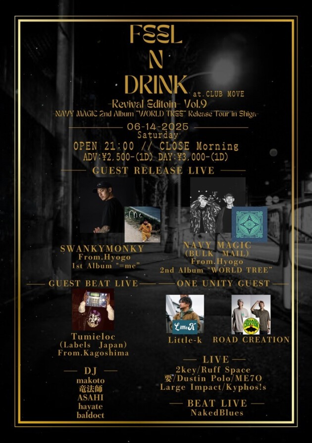 鹿児島県出身、滋賀県在住ビートメイカーNakedBluesにより、2020年からK.S BARにて不定期で開催されていた"FEEL N DRINK"が、場所をCLUB MOVEに移し、約1年半の時を経て復活。RELEASE GUESTとして、兵庫県より2025年4月に1st Album"=me"をリリースしたSWANKYMONKY、また自身が所属するレーベル"BULK MAIL"より2025年2月に2nd Album"WORLD TREE"をリリースしたNAVY MAGICの2組が来滋。更に、鹿児島県在住時から親交があり、自身がビートメイクを始めるきっかけとなったとも言える、鹿児島県在住Beatmaker、Tumieloc(Labels Japan)も2021年11月以来、約3年半ぶりに滋賀の地にてplay。開催当初から、Feel,Drink,Field Linkをテーマにしたイベントとなっており、今回も例に違わず、Reggaeサイドより、自身が絶大な信頼を置くLittle-K,ROAD CREATIONがONE UNITY GUESTとして登場。LIVE、DJ陣も地元滋賀のプレイヤーはもちろんのこと、兵庫、京都からも猛者が集い、重厚かつ濃厚、最高かつ最幸の空間になること間違いなし。