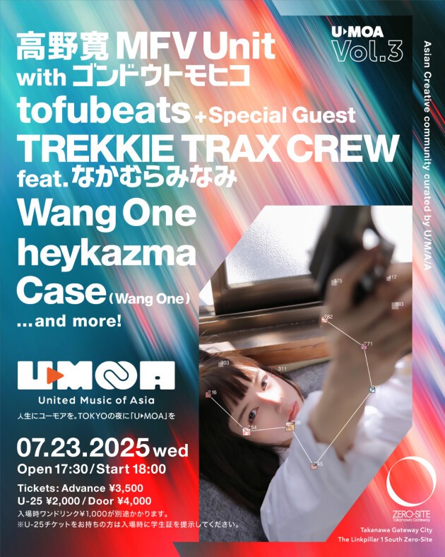 2022年、「U▷MOA」は、音楽レーベル「U/M/A/A」が、 アジアの新しいアートと音楽の才能を紹介するイベントとして、 東京/麻布の小さなクラブで、「Vol.0(ゼロ)」から静かに始まりました。 3回の開催を経て、次第に拡張していった「U▷MOA」。 7月23日(水)、今話題のZERO-SITE Takanawa Gateway にて、「U▷MOA vol.3」を開催い たします。