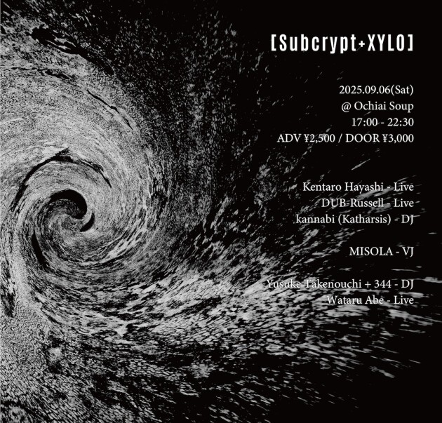 地下電子音楽の最前線を追求する「Subcrypt」と、未知のサウンドスケープを開拓する「XYLO」による共同イベント[Subcrypt+XYLO]が、2025年9月6日(土)にOchiai Soupにて開催決定。大阪からはVMOのマニピュレーターとしても知られているKentaro Hayashi、東京からはCHANNELにて圧倒的なパフォーマンスを繰り広げるDUB-Russellを招き、深海のように沈み込む音響、鋭く閃く電子の粒、そして圧倒的な低音の波が交錯する一夜。音楽の深みと新しさを求める者たちに向けた、強烈かつ鮮烈な体験を届ける。
