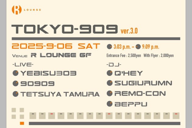 毎年9月9日に盛り上がる、Rolandの伝説のドラムマシン「TR-909」の日を記念し、909を使ったライブアクト3組と、909にちなんだセットを披露するDJ陣が並び立つイベント "Tokyo-909" が、渋谷のR Loungeにて、9/6土曜午後3:03~9:09までの限定で開催。