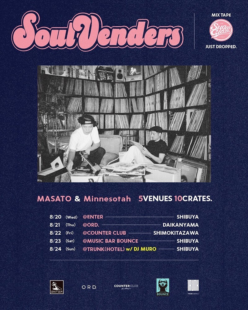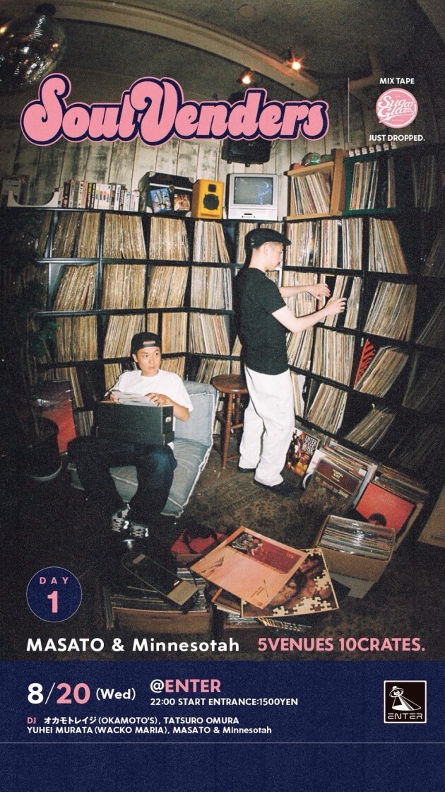 フィジカルでの新作ミックステープをドロップしたMASATOとMinnesotahによる都内5ヶ所5日間連続のスペシャルなパーティ。その初日となる8/20はOKAMOTOREIJI、 Tatsuro Omura、Yuhei Murataを招き、Enterでの豪華な一夜。