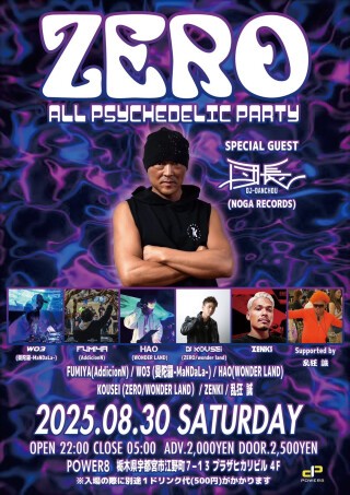 ZERO ALL PSYCHEDELIC PARTY.SPECIAL GUEST DJ 団長 ◆Supported by 乱狂 誠 ◆ORGANIZE & DJ KOUSEI ◆LINEUP DJ.FUMIYA. WO3.HAO. ZENK