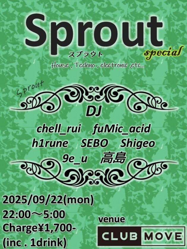 sproutは京都を中心にtechno , house , nardcore , 昭和歌謡等々をplayする高島による4つ打ちを中心とした様々なジャンルの新芽DJの芽生え、成長を促進するイベントです。