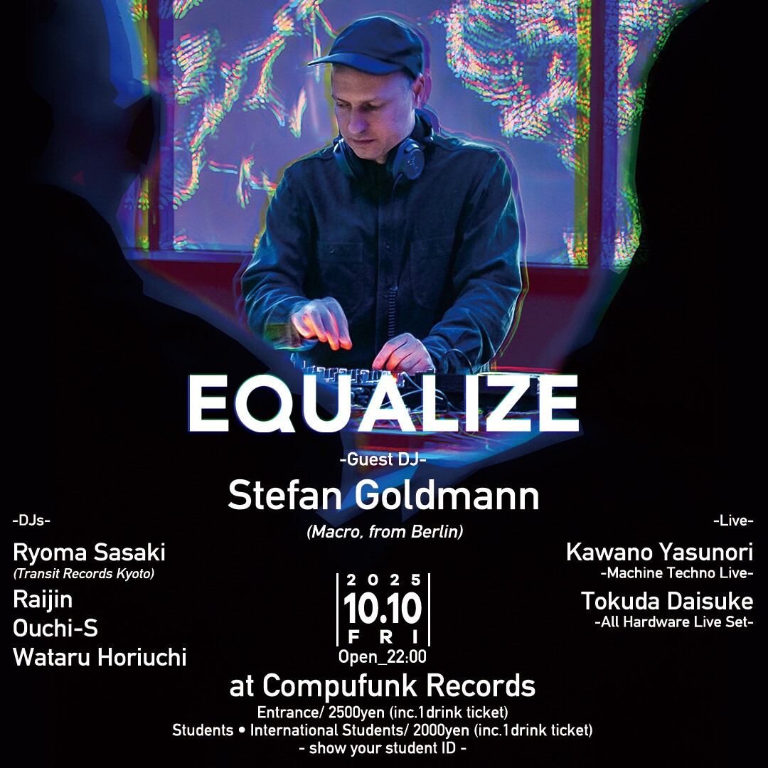 Stefan Goldmann has been playing regularly at Berghain / Panorama Bar since 2006. He has performed at leading festivals including SXSW, Mutek and Time Warp, and tours regularly throughout Europe, Asia, Australia and the Americas. Since 2020 he curates Strom Festival at the Berlin Philharmonic, and since 2007 he runs his own label, Macro, which has released many masterpieces. The state-of-the-art DJ/Artist Stefan Goldmann who is actively expanding his music activities worldwide is coming back to Osaka!