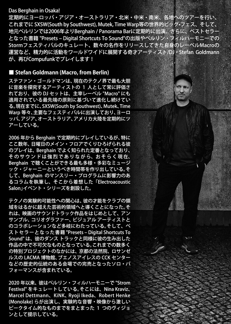 定期的にヨーロッパ・アジア・オーストラリア・北米・中米・南米、各地へのツアーを行い、これまでに SXSW (South by Southwest), Mutek, Time Warp 等の世界的ビッグ・フェス、そして、地元ベルリンでは2006年より Berghain / Panorama Barに定期的に出演。さらに、ベストセラーとなった書籍 "Presets – Digital Shortcuts To Sound"の出版やベルリン・フィルハーモニーでのStormフェスティバルのキュレート、数々の名作をリリースしてきた自身のレーベルMacroの運営など、精力的に活動をワールドワイドに展開する奇才アーティスト/DJ・Stefan Goldmannが、再びCompufunkでプレイします!