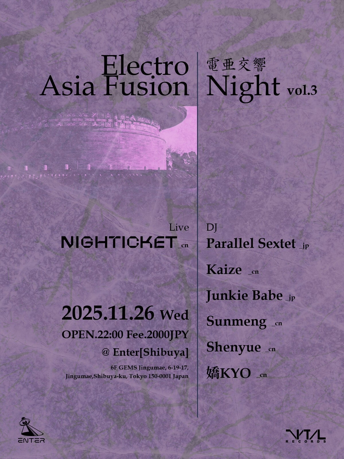 近年熱気を増し続ける中国アンダーグラウンドクラブシーンと、日本の個性豊かなアーティストたちが邂逅する本イベント。第3弾となる今回は、シンセポップにプログレッシブ・ハウスの要素を融合させ、国内外のフェスで注目を集める北京のエレクトロ・デュオ Nighticket が登場。さらに、中国クラブカルチャーを黎明期から牽引してきたベテランDJ Kaize、ブラックミュージックをルーツに唯一無二のグルーヴを紡ぐ女性DJ Sun Meng、90年代のパンクシーンからキャリアをスタートし、現在はDJとして独自の美学を提示し続ける Shenyue、そしてサイケデリックやトライバルの要素を取り入れ恍惚的なプレイを展開する 嬌KYOが出演する。