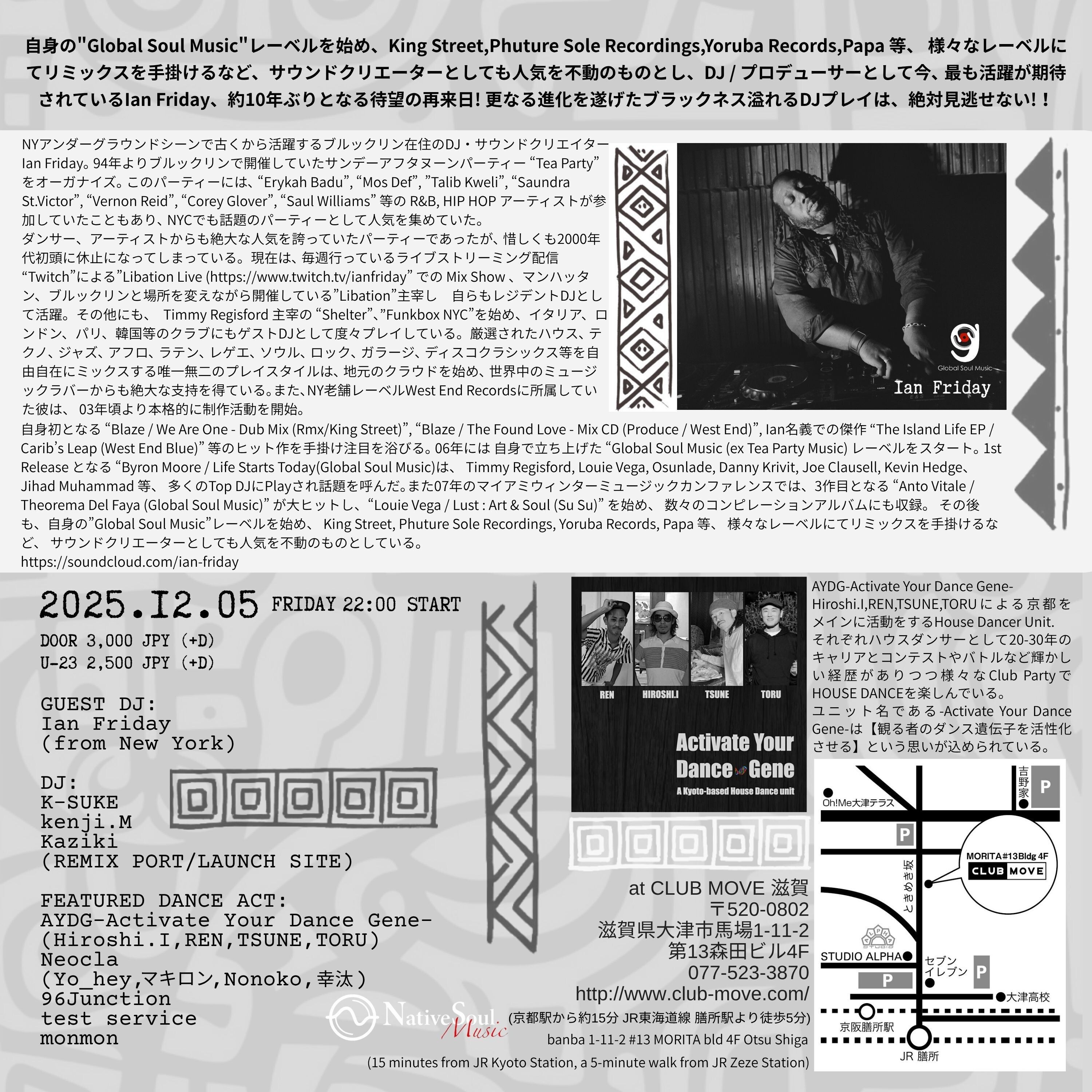 NYアンダーグラウンドシーンで古くから活躍するブルックリン在住のDJ・サウンドクリエイター Ian Friday。 94年よりブルックリンで開催していたサンデーアフタヌーンパーティー “Tea Party” をオーガナイズ。 このパーティーには、 “Erykah Badu”, “Mos Def”, ”Talib Kweli”, “Saundra St.Victor”, “Vernon Reid”, “Corey Glover”, “Saul Williams” 等の R&B, HIP HOP アーティストが参加していたこともあり、 NYCでも話題のパーティーとして人気を集めていた。 ダンサー、アーティストからも絶大な人気を誇っていたパーティーであったが、 惜しくも2000年代初頭に休止になってしまっている。現在は、 毎週行っているライブストリーミング配信 “Twitch”による”Libation Live (https://www.twitch.tv/ianfriday” での Mix Show 、マンハッタン、ブルックリンと場所を変えながら開催している”Libation”主宰し 自らもレジデントDJとして活躍。その他にも、 Timmy Regisford 主宰の “Shelter”、”Funkbox NYC”を始め、イタリア、ロンドン、パリ、韓国等のクラブにもゲストDJとして度々プレイしている。厳選されたハウス、 テクノ、 ジャズ、 アフロ、 ラテン、 レゲエ、 ソウル、 ロック、 ガラージ、 ディスコクラシックス等を自由自在にミックスする唯一無二のプレイスタイルは、 地元のクラウドを始め、 世界中のミュージックラバーからも絶大な支持を得ている。また、NY老舗レーベルWest End Recordsに所属していた彼は、 03年頃より本格的に制作活動を開始。 自身初となる “Blaze / We Are One - Dub Mix (Rmx/King Street)”, “Blaze / The Found Love - Mix CD (Produce / West End)”, Ian名義での傑作 “The Island Life EP / Carib’s Leap (West End Blue)” 等のヒット作を手掛け注目を浴びる。 06年には 自身で立ち上げた “Global Soul Music (ex Tea Party Music) レーベルをスタート。 1st Release となる “Byron Moore / Life Starts Today(Global Soul Music)は、 Timmy Regisford, Louie Vega, Osunlade, Danny Krivit, Joe Clausell, Kevin Hedge、Jihad Muhammad 等、 多くのTop DJにPlayされ話題を呼んだ。また07年のマイアミウィンターミュージックカンファレンスでは、3作目となる “Anto Vitale / Theorema Del Faya (Global Soul Music)” が大ヒットし、“Louie Vega / Lust : Art & Soul (Su Su)” を始め、 数々のコンピレーションアルバムにも収録。 その後も、自身の”Global Soul Music”レーベルを始め、 King Street, Phuture Sole Recordings, Yoruba Records, Papa 等、 様々なレーベルにてリミックスを手掛けるなど、 サウンドクリエーターとしても人気を不動のものとしている。