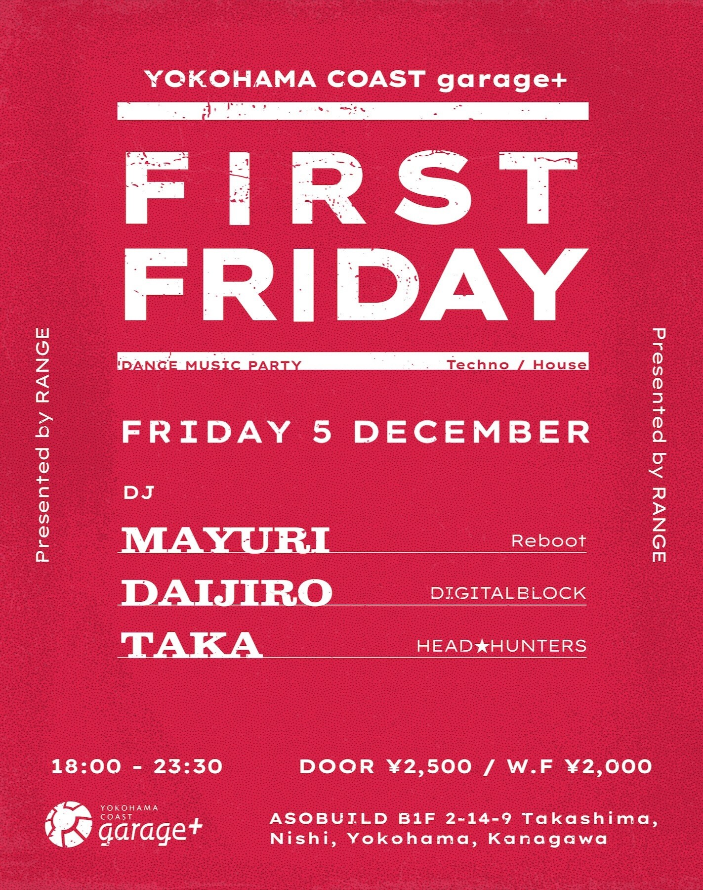 来年2026年2月より、横浜駅直通アソビル地下1階「YOKOHAMA COAST garage+」にて毎月第一金曜にスタートする新レギュラーパーティー「RANGE FIRST FRIDAY」のプレパーティーが12月5日(金)に開催決定!