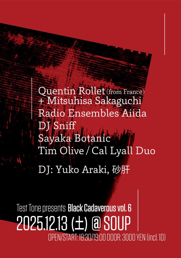 第6回となる「Black Cadaverous」では、即興的なアコースティックからエレクトロニクス、予測不能なパフォーマンスまで、多様なアプローチで探求するアーティストが集結します。