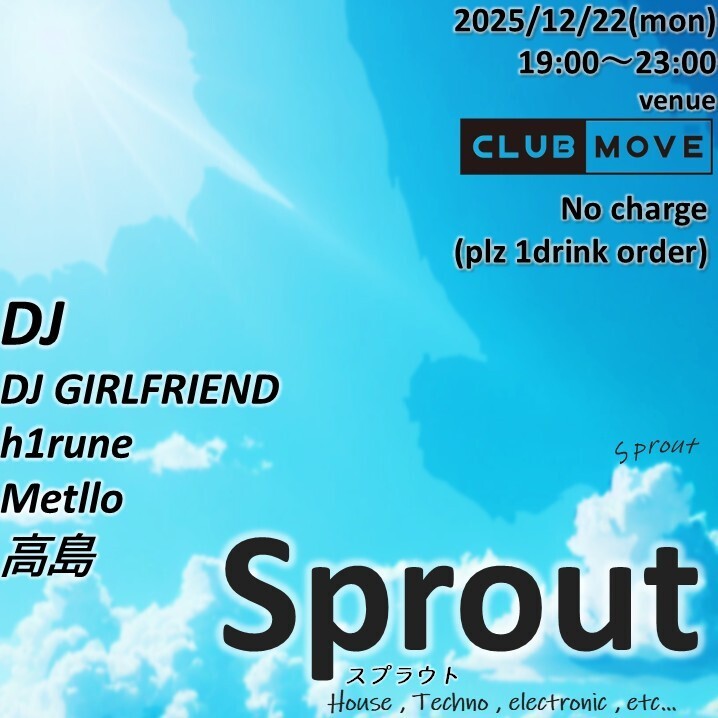 sproutは京都を中心にtechno , house , nardcore , 昭和歌謡等々をplayする高島による4つ打ちを中心とした様々なジャンルの新芽DJの芽生え、成長を促進するイベントです。 共に成長を刺激し合える仲間の出会い、新しい人材発見の場として是非ごゆるりとご利用下さい。