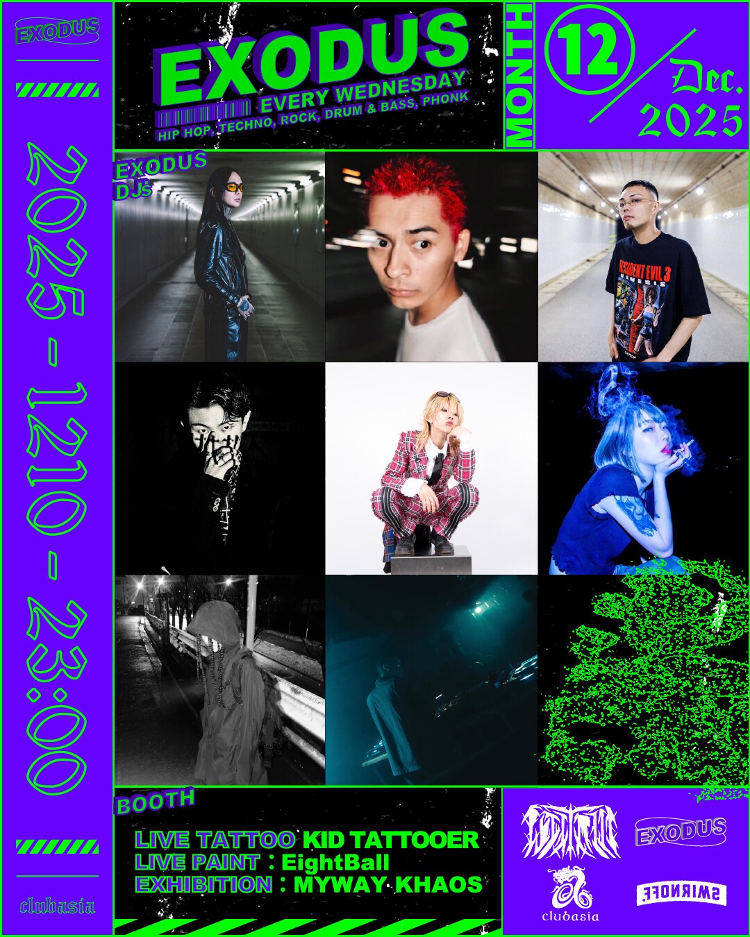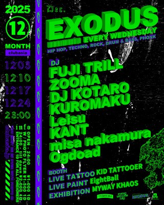 ✸ FUJI TRILLをはじめ多方面に活躍するDJ , BeatMakerが毎週水曜の渋谷の夜をにぎわす通称"エクソ"。12月のクリスマス期間中にはスペシャルな" X'ma TATTOO NIGHT"の開催が決定。隔週のLIVE PAINT, LIVE TATTOO, EXHIBITIONも引き続き充実したLINEUPでお届け