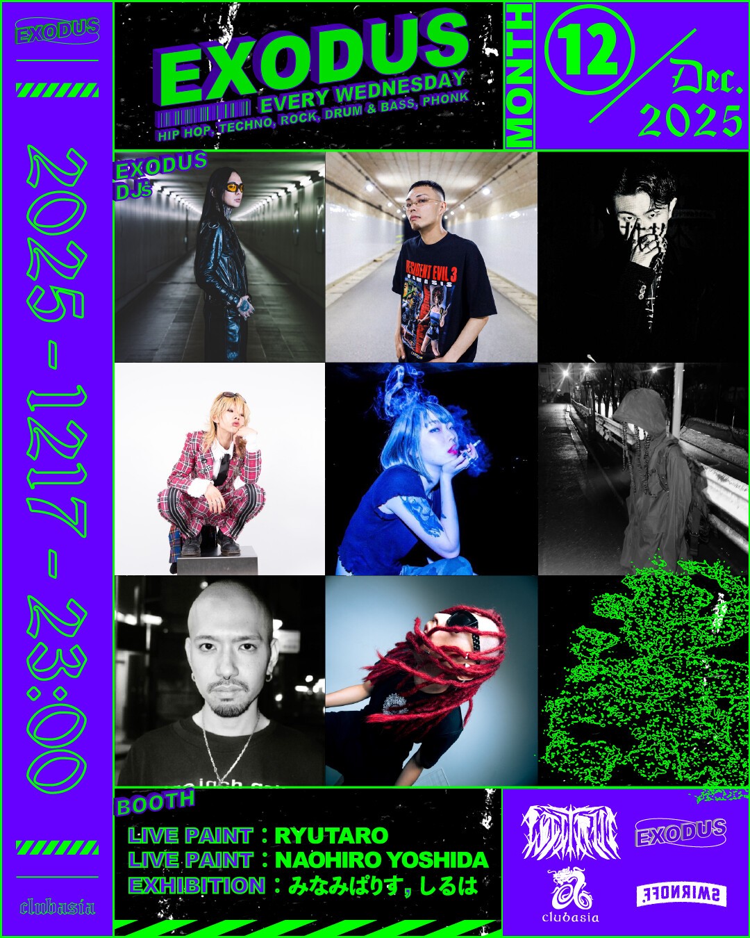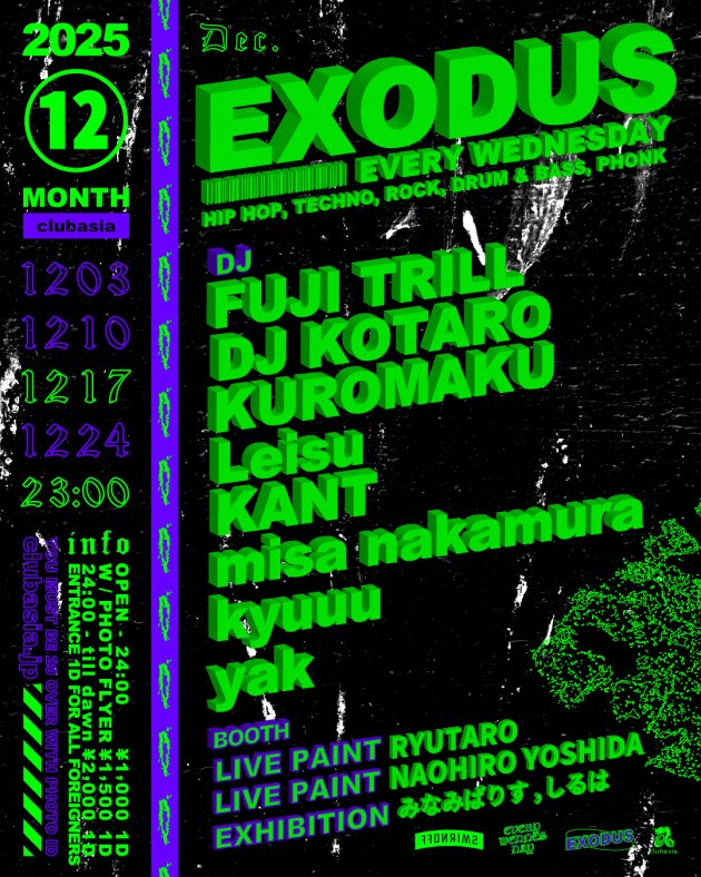 ✸ FUJI TRILLをはじめ多方面に活躍するDJ , BeatMakerが毎週水曜の渋谷の夜をにぎわす通称"エクソ"。12月のクリスマス期間中にはスペシャルな" X'ma TATTOO NIGHT"の開催が決定。隔週のLIVE PAINT, LIVE TATTOO, EXHIBITIONも引き続き充実したLINEUPでお届け