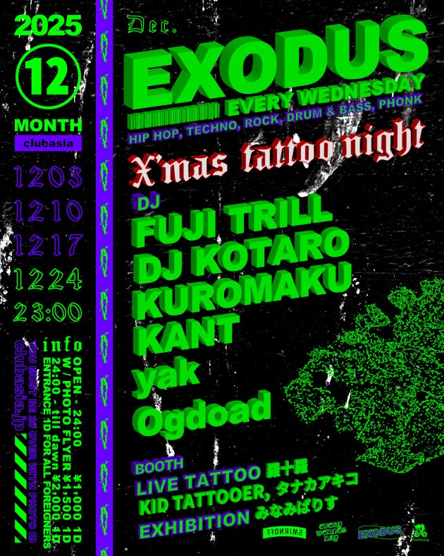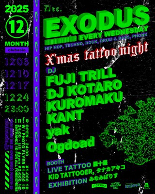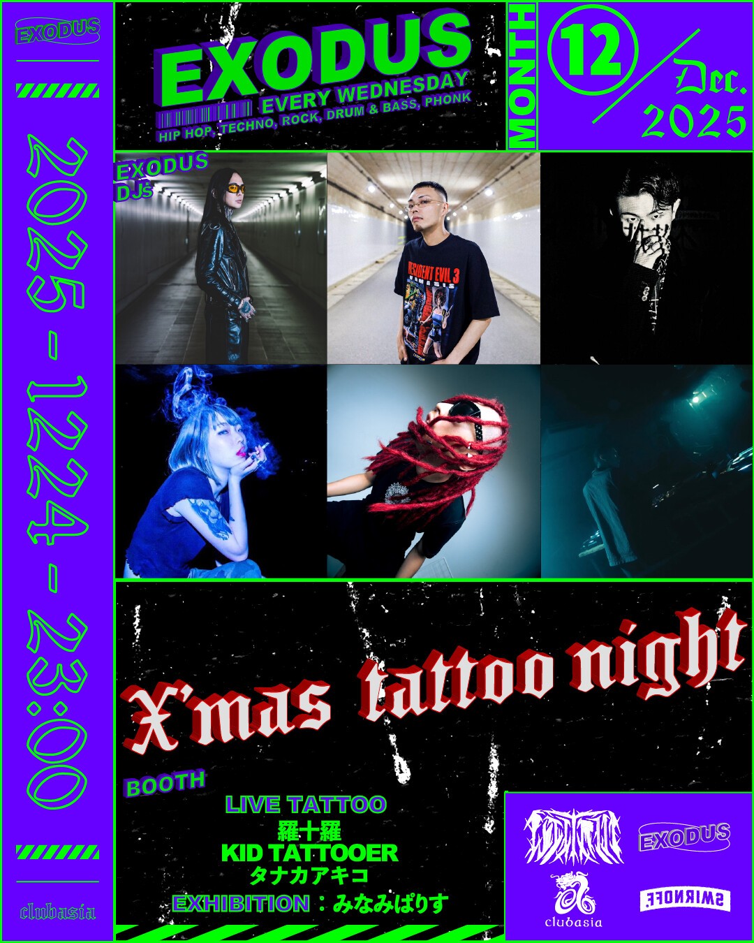 ✸ FUJI TRILLをはじめ多方面に活躍するDJ , BeatMakerが毎週水曜の渋谷の夜をにぎわす通称"エクソ"。12月のクリスマス期間中にはスペシャルな" X'ma TATTOO NIGHT"の開催が決定。隔週のLIVE PAINT, LIVE TATTOO, EXHIBITIONも引き続き充実したLINEUPでお届け