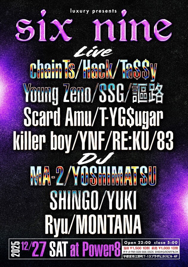 【six nine】▼LIVE, chainTs, Hack, Ta$$y, Young Zeno, SSG, 謳路, Scard Amu, T-YG$ugar, killer boy, YNF, RE:KÜ, 83, ▼DJ, MA-2, YOSHIMATSU, SHINGO