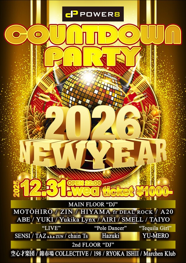 POWER8 2026 countdown party,Main Floor】 ▼DJ, MOTOHIRO, ZIN, HIYAMA fr DEAL ROCK, A20, ABE, YUKI, Yukika Lynx, AIRI, SMELL, TAIYO, ▼Live, SE