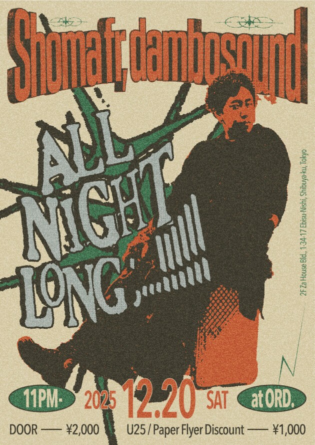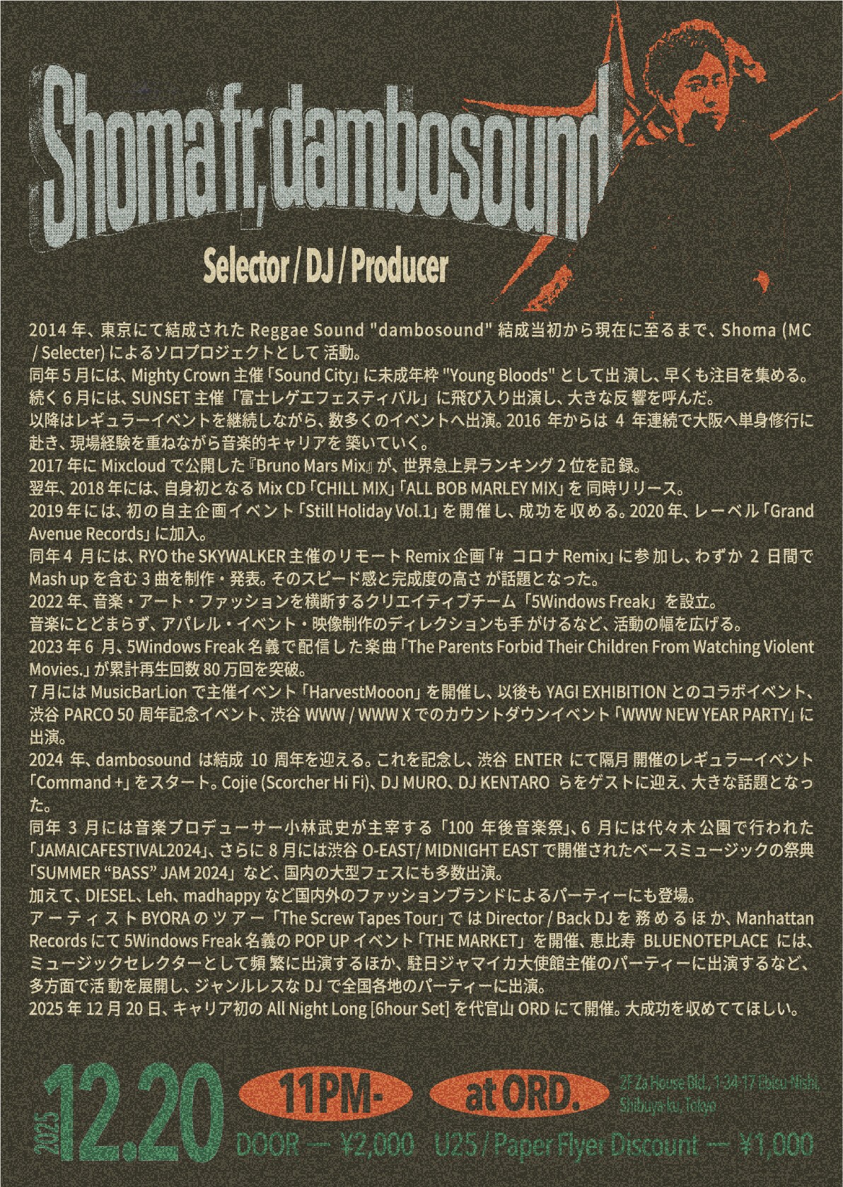 レゲエを核に持ちながら、ジャンルという名の境界線を軽やかに飛び越えるセレクター Shoma fr,dambosound。キャリアの集大成として、2025年12月20日(土)、代官山 ORD.にて初のオールナイト・ロングセットイベント「All Night Long;...!!!!!!」を開催。