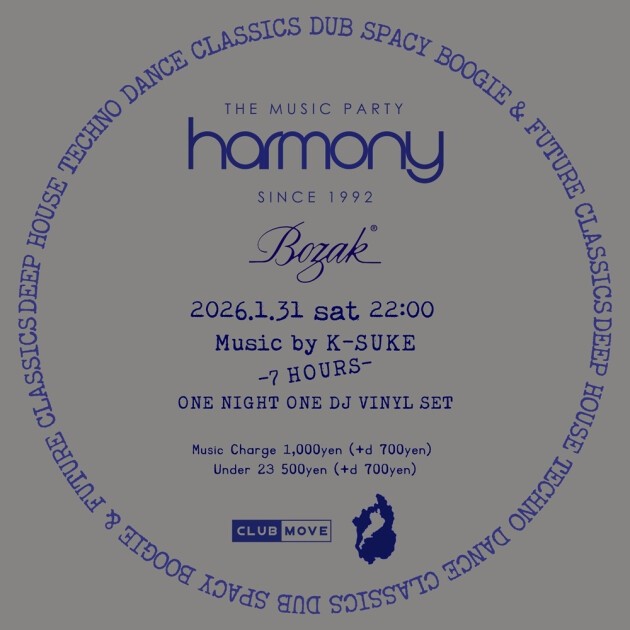 The first HARMONY of the New Year is titled '-7HOURS-,' where K-SUKE, who is celebrating his 40th anniversary as a DJ this year, will return to his roots and deliver 7 hours of music using three turntables and a BOZAK rotary mixer, exclusively with vinyl records.