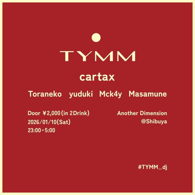 パーティの中で皆を笑顔にしていくポジティブなバイブスも含め、「TYMM」メンバー全員がファンであるcartax氏を、新年一発目のゲストとして再び招聘できたことは非常に嬉しい。「TYMM」がプレゼンツする新年会として、是非現地で楽しんでいただきたい。