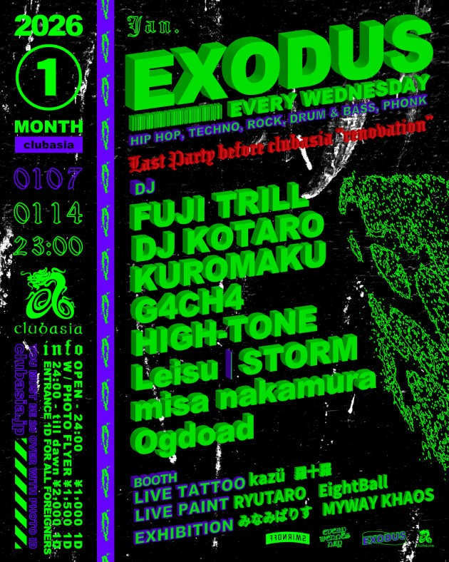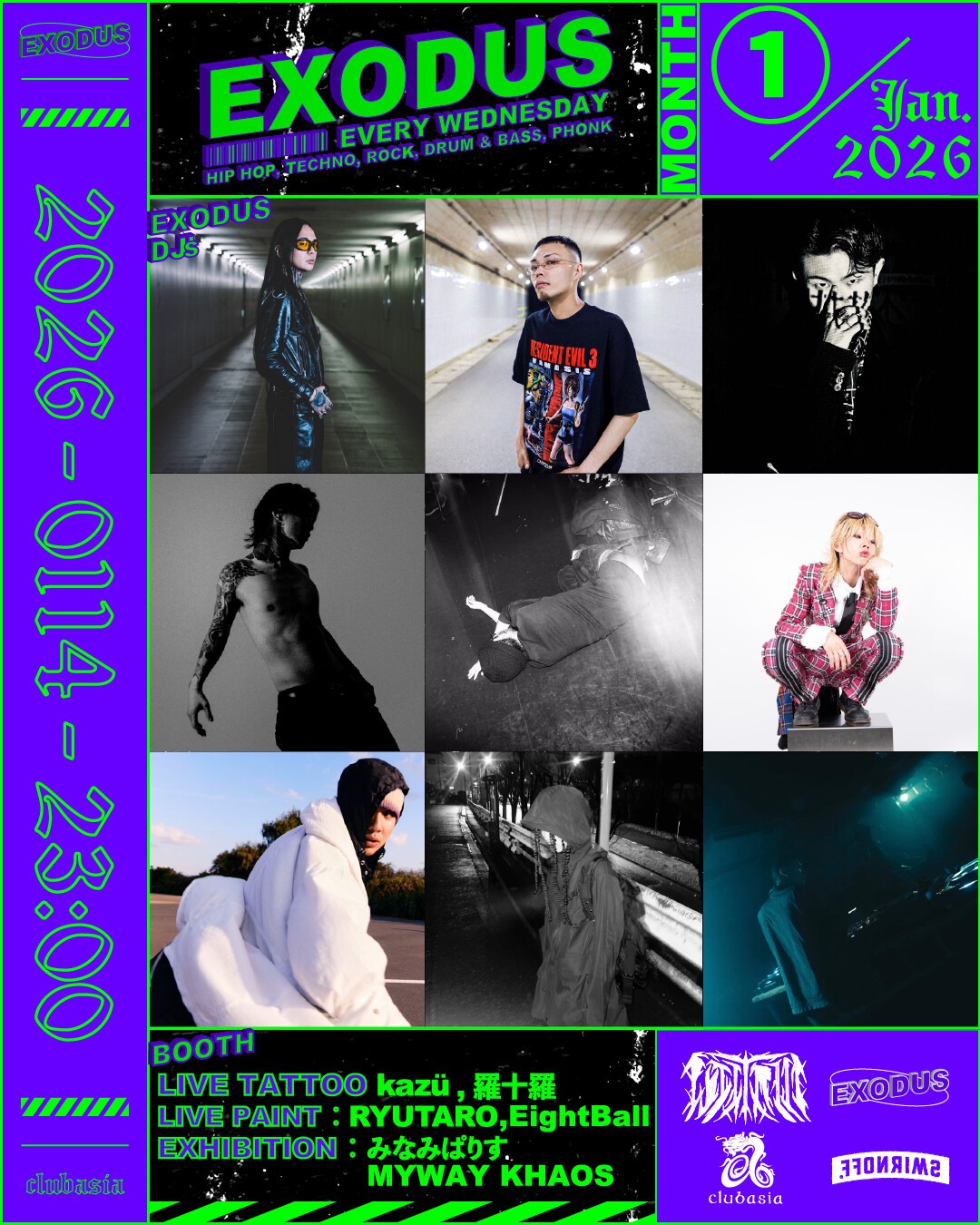 ✸ FUJI TRILLをはじめ多方面に活躍するDJ , BeatMakerが毎週水曜の渋谷の夜をにぎわす通称"エクソ"。毎週展開されるBOOTHではLIVE PAINT, LIVE TATTOO, EXHIBITIONがEXODUSの輪郭をより表現。充実のLINEUPでお届けする2026年の"EXO"はclubasia改装の為、1月7日 / 14日の開催をもって最終週1月28日〜2月末までRuby Roomへ移動。初の他venue開催で新たな表現が見れそうだ。改装前ラストとなるエクソも要チェック !!