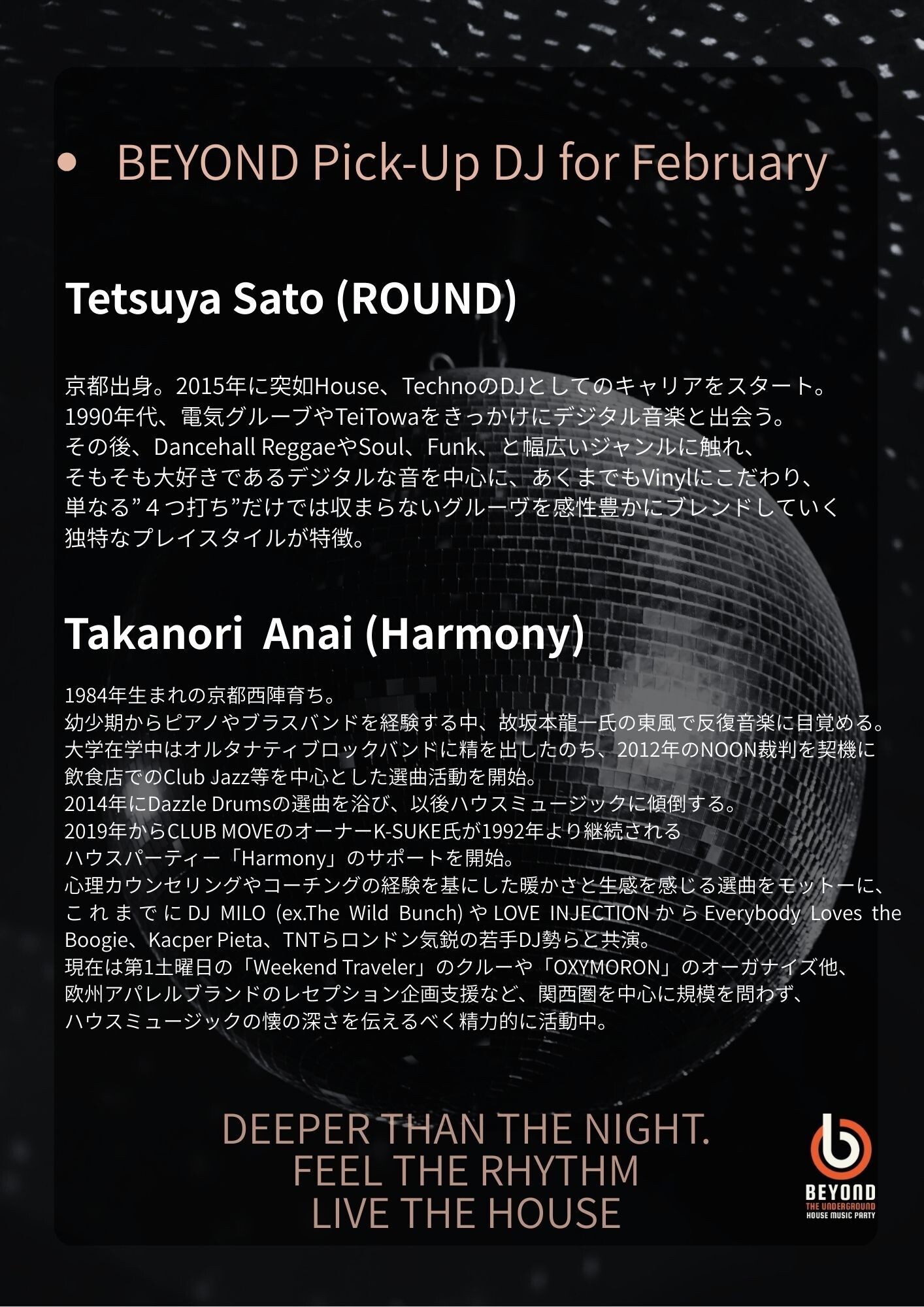 異なる音楽的バックグラウンドを持つ2人のDJを迎え、