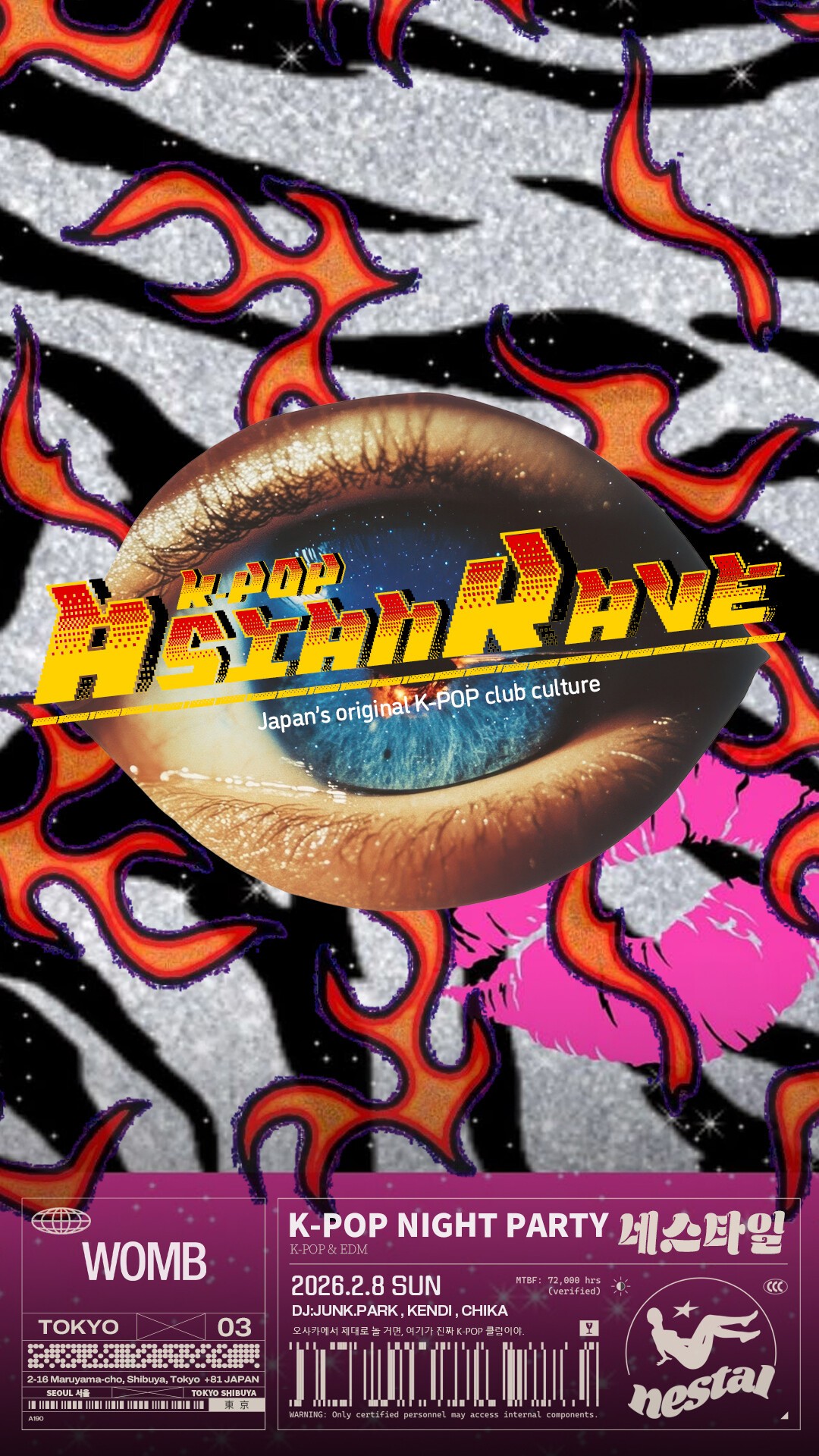 渋谷WOMBで開催されるK-POPクラブイベント「NESTAL」。 K-POPをクラブミュージックとして再構築し、 DJ JUNK.PARK、KENDI、CHIKAが世界基準のサウンドでプレイ。