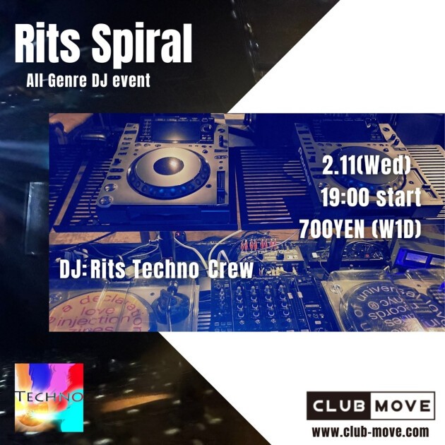 "Rits Spiral" is an all-genre event held by Ritsumeikan University's DJ circle, "Ritsumeikan Techno Club," on the second Wednesday of even-numbered months. It's an event that lasts until the last train, so feel free to drop by!