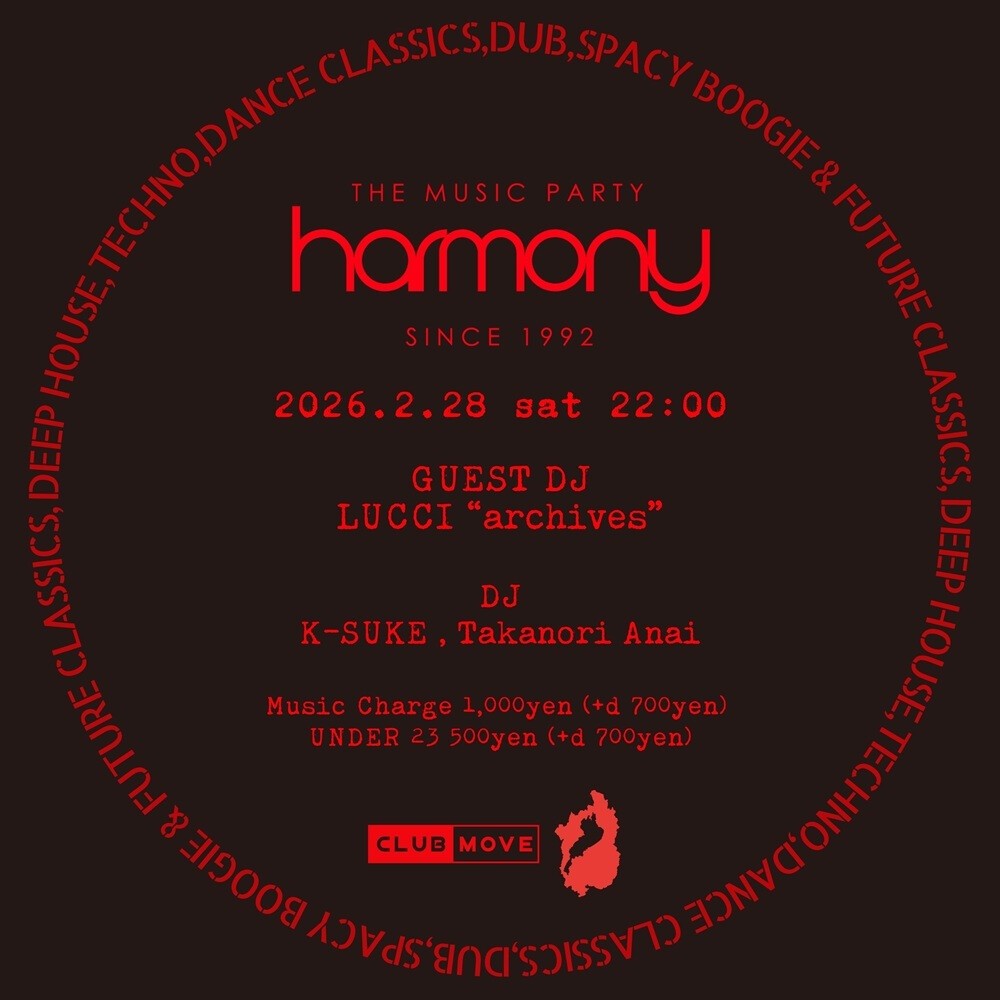 2月のHARMONYはMOVEにて不定期開催の "archives" より "LUCCI" が登場。 90年代中頃の京都で開催していたHARMONYでも何度かPLAY経験のある "LUCCI ex JUN"が 約30年ぶりにHARMONYにてDJを聞かせてくれます。