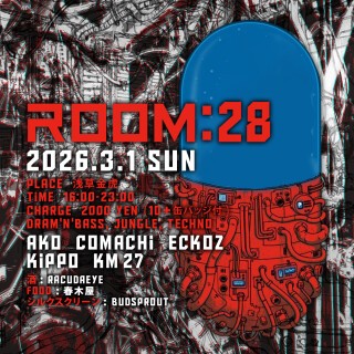 ROOM:28 vol.2 Date : 2026/03/01(SUN) Time : 16:00〜23:00 Charge : 2000 (1D + ROOM:28缶バッジ付) Music : DRUM'N'BASS, JUNGLE, TECHNO Underground