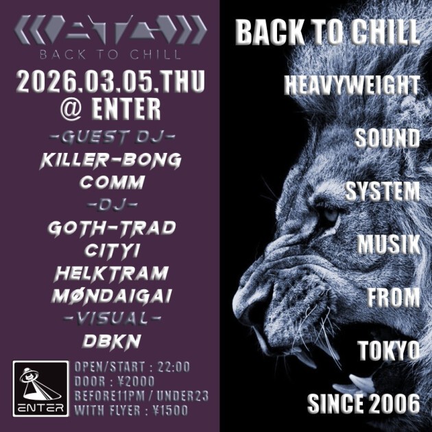 主宰GOTH-TRADがUKのダブステップ・シーンと繋がるきっかけとなった自身のタイトル「Back To Chill」を由来に、2006年に始動した同名のパーティは日本初のレギュラー・ダブステップ・パーティとして話題を呼び、国内のヘッズのみならず、海外のベース・ミュージック・ファンからも注目を集め、今やダブステップ/ベースミュージック・パーティの最高峰かつ代名詞にもなっている。ベースの唸りが床を震わせ、聴衆を低音の沼に引き入れる。体が震えるほどの重低音を体感できる贅沢な平日木曜の夜。