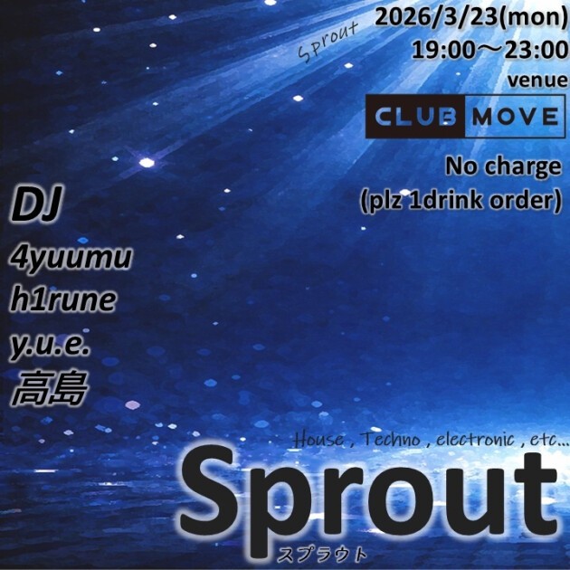 sproutは京都を中心にtechno , house , nardcore , 昭和歌謡等々をplayする高島による4つ打ちを中心とした様々なジャンルの新芽DJの芽生え、成長を促進するイベントです。 共に成長を刺激し合える仲間の出会い、新しい人材発見の場として是非ごゆるりとご利用下さい。
