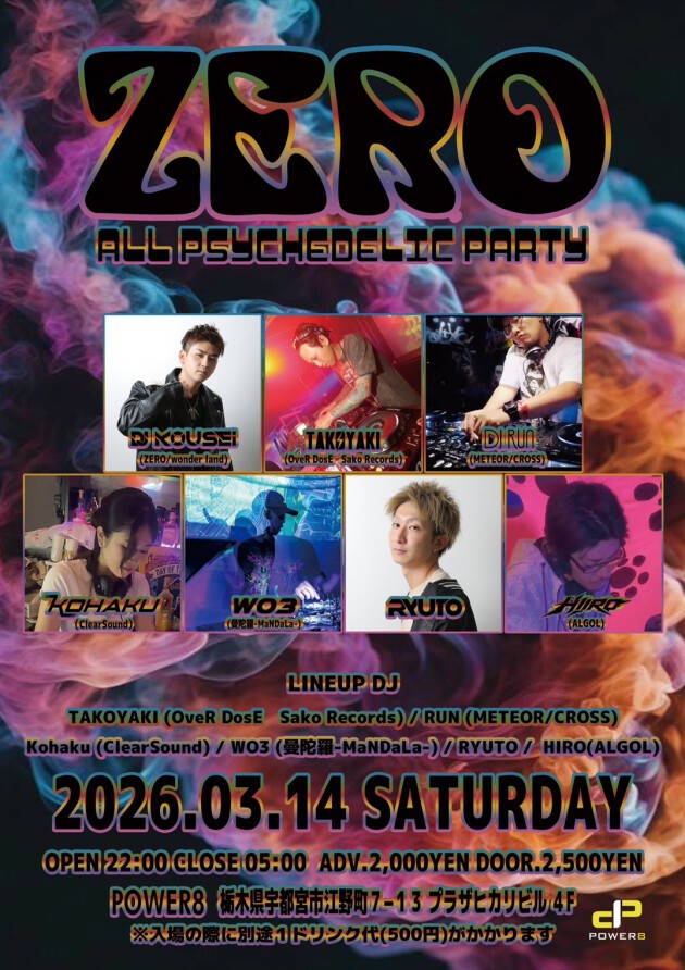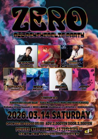 ZERO 'ALL PSYCHEDELIC PARTY' ,KOUSEI (ZERO/WONDER LAND), ◆LINEUP DJ, TAKOYAKI (OveR DosE Sako Records), RUN (METEOR/CROSS), Kohaku(Clear