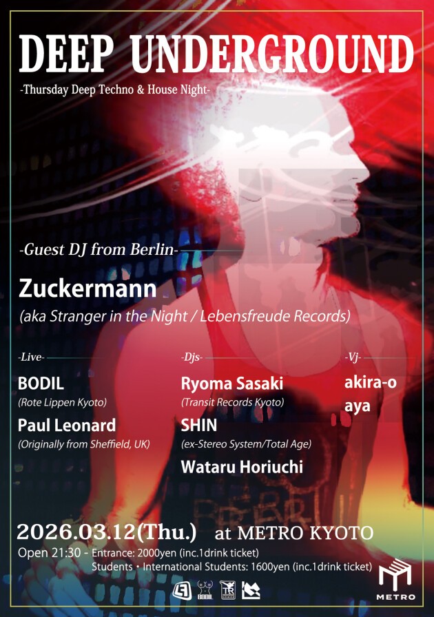 そして、電気グルーヴのオープニングアクト等、精力的にクラブ・ライブハウスで活動を続け、アルバム「KÖRPERKOMPLEX」も好調なEBM/New Wave ライブ・アクト『BODIL』、そして、Tresor.Berlin、Renate、Ipse、Golden Gate 等々、ベルリンのトップ・クラブに出演し、コンスタントに楽曲をリリース (これまでに Scot Grooves, Tyree Cooper など著名DJがプレイ)、レーベル Transit Records Kyotoや京都や大阪でイベントを主宰する『Ryoma Sasaki』、Juan Atkins、Santiago Salazar、DJ3000 等のデトロイト勢アーティストを京都に招聘するなど数多くのイベントを手掛け、2024年から Music Bar "S-pod"を運営する『SHIN』の他、強力レギュラー陣が出演します!