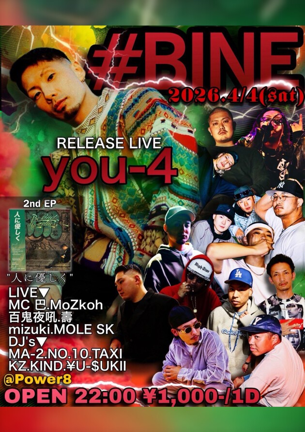 #BINE PRESENT『you-4 2nd EP【人に優しく"Be kind to others “】 RELEASE PARTY 』,you-4, LIVE▼ MC巴, MoZkoh, 百鬼夜吼, 壽, mizuki, MOLE SK, DJ's,▼ MA-2, NO.