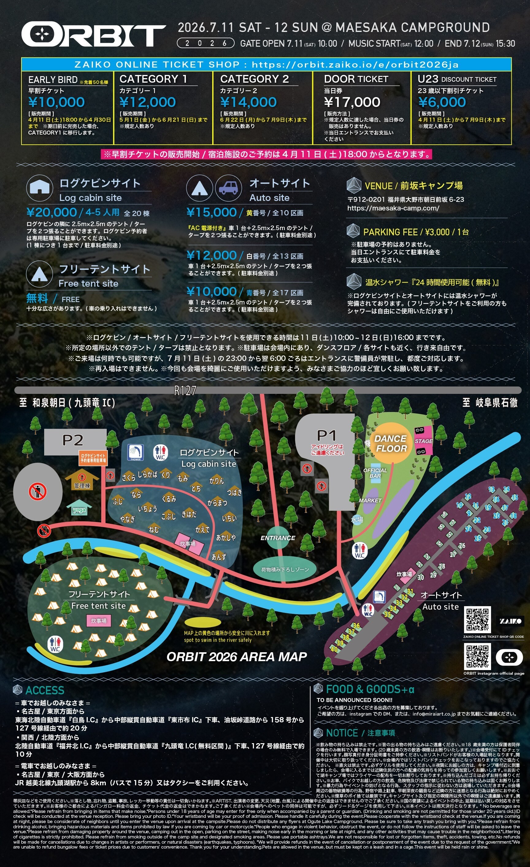 今夏のオープンエア『ORBIT 2026』は、7月11日(土)12日(日)、みなさま、地域様のご協力で場所は昨年と同じく『前坂キャンプ場/福井県-九頭竜湖北-』での開催となります。芝生のダンスフロアとフラットなフィールド、多数のログケビン/オートサイト/十分なフリーテントサイト、そしてサイト中央には名峰白山からの清流が流れており、どのサイトからも入水することができます。 また、全てのサイトに水洗トイレ/炊事場が完備されており、場内に2か所ある温水シャワーは『24時間使用可能/無料開放』となっているので、ゆったり快適にお過ごしいただけるかと思います。