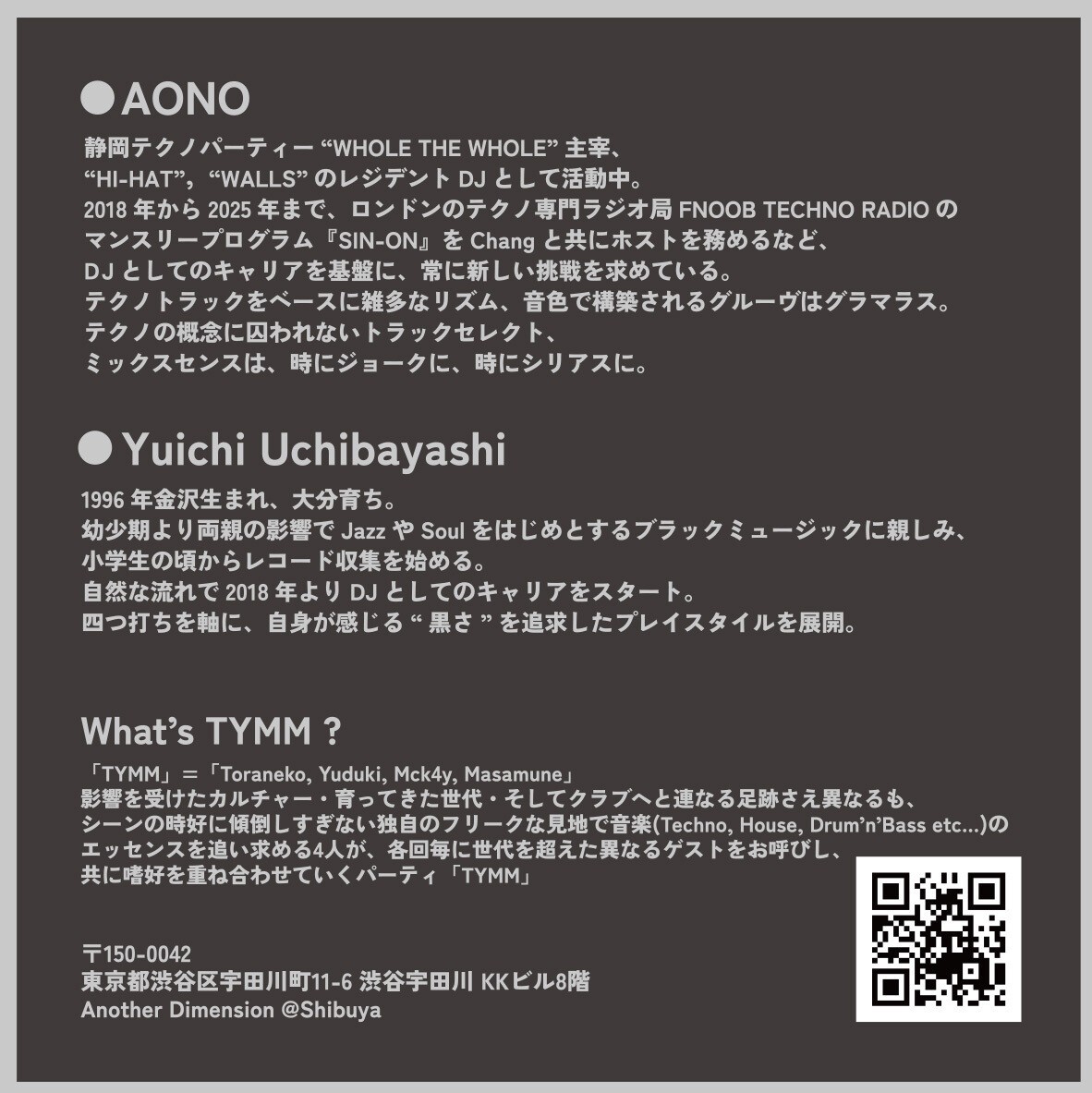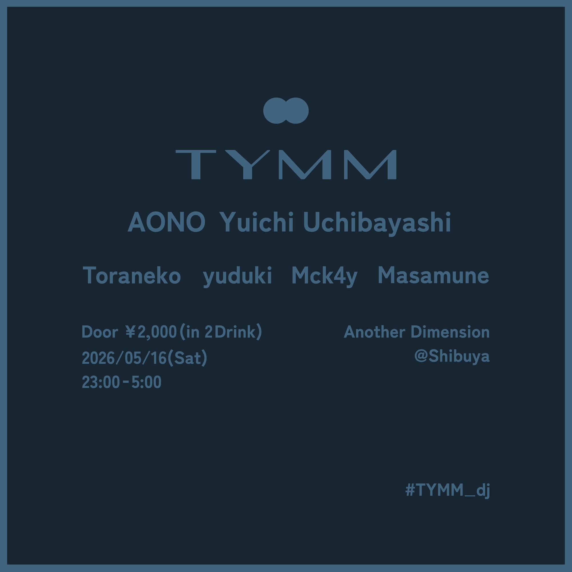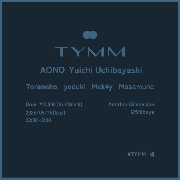影響を受けたカルチャー・育ってきた世代・そしてクラブへと連なる足跡さえ異なるも、シーンの時好に傾倒しすぎない独自のフリークな見地で音楽(Techno, House, Drum’n’Bass etc…)のエッセンスを追い求める4人が、各回毎に世代を超えた異なるゲストをお呼びし、共に嗜好を重ね合わせていくパーティ「TYMM」