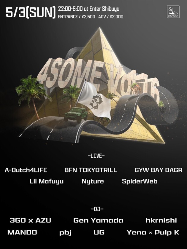 足立区北千住に位置するJuice Bar Rocket Kitasenjuをホームに、渋谷池袋大阪での出張開催を含め、これまでに15回開催してきた4SOME。Vol.16は足立区(ADC)に所縁のあるアーティストを、渋谷に位置するENTERに招集する。