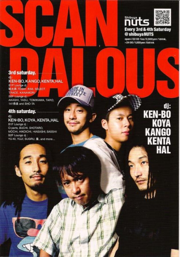 shibuyaNUTSオープン以来の大定番パーティ"SCANDALOUS"。美味しいお酒とおしゃれな雰囲気、朝まで踊れる最高な選曲は、一度味わったら絶対ヤミツキ! そんな夜をプロデュースするのは、日本のクラブシーンを代表するDJ陣。まず、フロアロッカーとして知らない者はいないKEN-BO、KOYA、KANGOの3DJ。そして、近頃人気も実力もうなぎのぼり中!、KENTAとHAL。メインストリームを核にしながらもそれぞれのDJの個性を落とし込んだプレイで、パーティフリークさえもうならえる! もちろん、B2FのRED ROOM、B1FのMubellの2つのラウンジも若手DJたちが、メインとひと味違うアグレッシブなプレイで盛り上げる! 第3、4土曜日は"SCANDALOUS"でキマリでしょ!