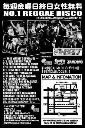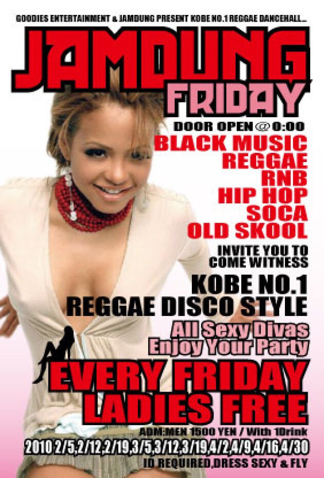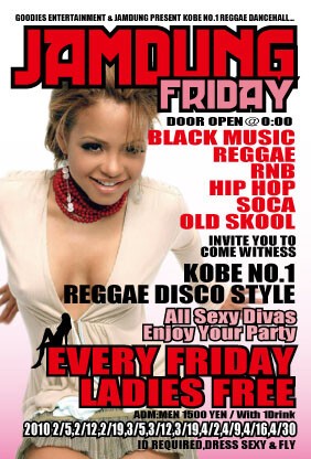 毎週金曜日(第4金曜日のみRUB-A-DUB NIGHT "RAGGAMUFFIN")に神戸JAMDUNGにてLADIES NIGHT、JAMDUNG FRIDAY開催決定。女性入場無料!!