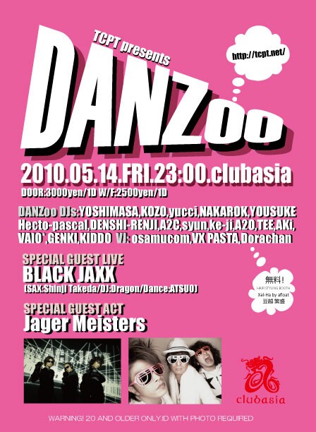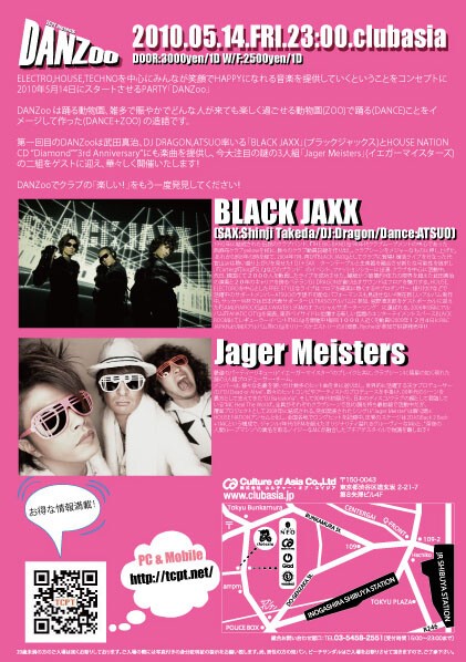 第一回目のDANZooは武田真治、DJ DRAGON,ATSUO率いる「BLACK JAXX」(ブラックジャックス)とHOUSE NATIONCD “Diamond””3rd Anniversary”にも楽曲を提供し、今大注目の謎の3人組「Jager Meisters」(イエガーマイスターズ)の二組をゲストに迎え、華々しく開催いたします!