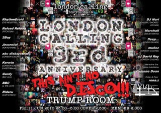 東京のUKクラブシーンを率いるLONDON CALLINGは2010年6月11日に3周年目を迎えます。La Fabriqueに始まりWarehouse 702を経て現在のTRUMP ROOMに至るまで、LONDON CALLINGは3年間続けてヨーロッパ最先端のアーティストと日本の一番ホットなDJ達がミックスするイベントを開催してきました。エレクトロからテクノ、そしてディスコから今後挑戦する新しいスタイルへの音楽旅行において、皆様の熱い支持を受けて大変感激しています。