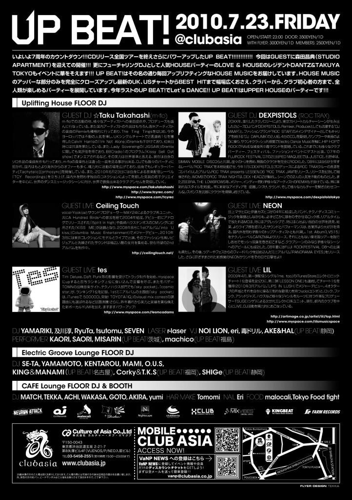 7th Anniversaryを迎えるUP BEAT!はその名の通り毎回Up liftingなHOUSE Musicをお届けしています。HOUSE MusicのUPPERな部分のみを完全にクローズアップし最新のUK、USチャートからBEST HITまで幅場広くおさえ、クラバーから、クラブ初心者の方まで、全人類が楽しめるパーティーを展開しています。